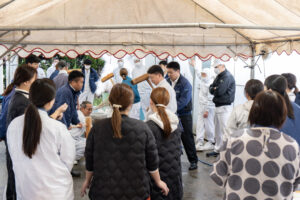 一番食品の餅つきは、多くの社員が参加する毎年恒例の行事となっています。