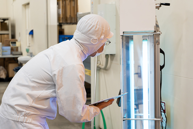 製造工場の工程管理や検査業務、証明書の作成をメインに担当しています。工程管理業務では、工場内のマニュアルやチェックシートの作成を行い、作業者が安全に作業ができるか、誰が行っても同じ作業ができるか、作業性に問題がないか、今のルールが適切かなどを検証し、検査業務では食品衛生法に準じた微生物検査や理化学検査を行い、製造した商品が仕様書通りにできているか確認し、安心・安全な商品を送り出せるように取り組んでいます。証明書の作成業務では、「工場の管理」について仕様書や証明書を作成しています。現在の食品業界では、品質に関する様々な内容証明が求められており、例えば原料の入荷から出荷までの製造工程や、異物混入を防止する方法を文書化し、お客様に提出しています。